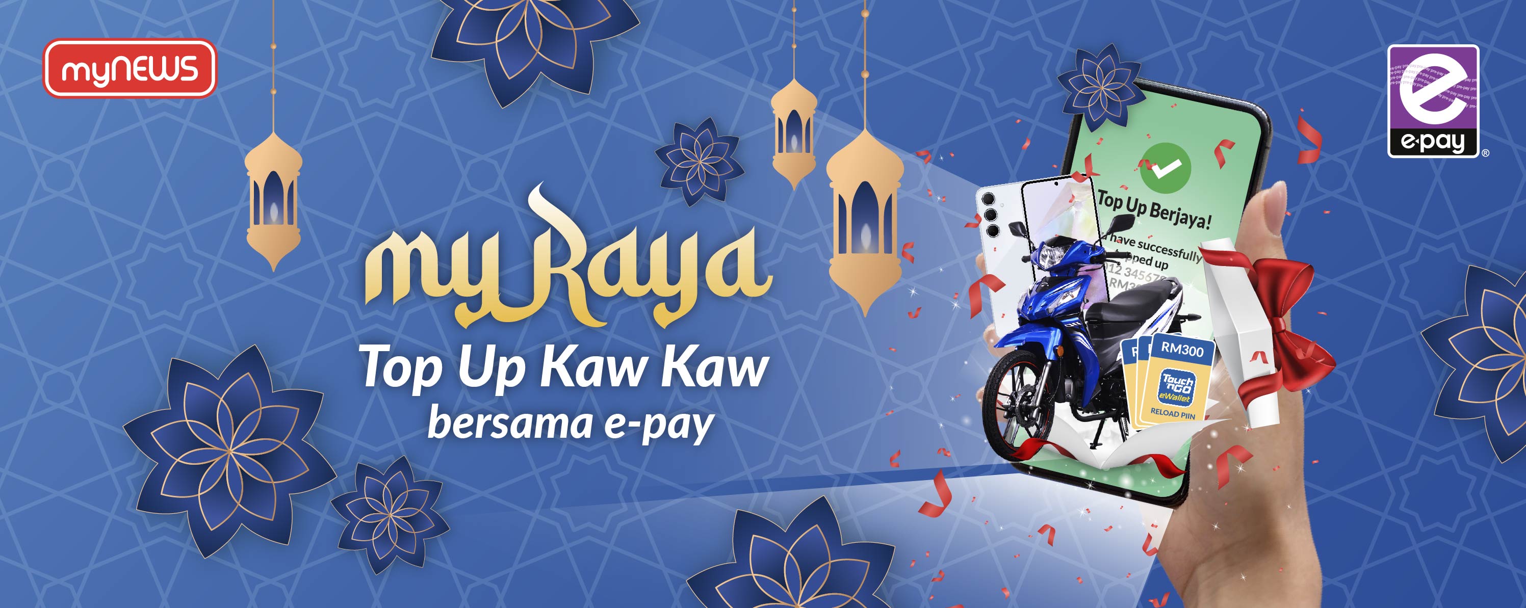 Rebut peluang untuk menang hadiah hebat, termasuk motosikal, dalam Kempen myRaya Top Up Kaw Kaw bersama e-pay! Hanya beli tambah nilai minimum RM30 dalam satu resit dari mana-mana kedai myNEWS. Lagi banyak penyertaan, lagi tinggi peluang untuk menang! Pemenang dengan penyertaan terbanyak akan membawa pulang hadiah-hadiah menarik di bawah!